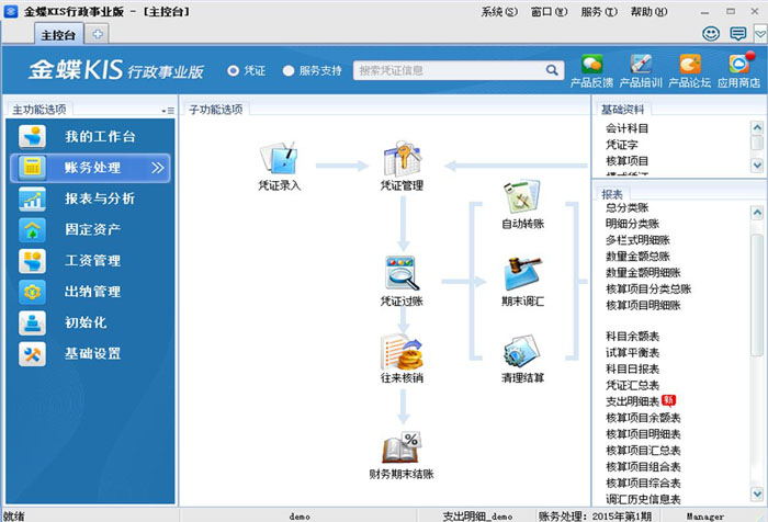 金蝶KIS行政事业版包括账务处理、固定资产、工资管理、报表与分析、出纳管理等功能模块,全方位满足行政单位、事业单位对财务核算精细化、确保资产保值增值的要求。